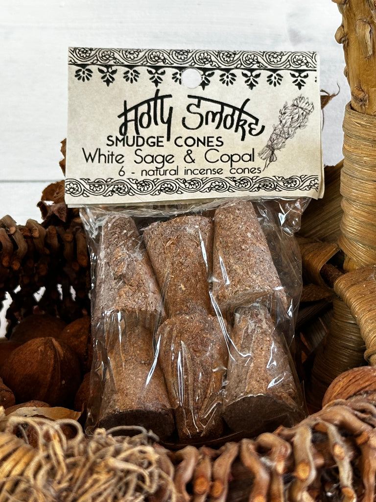These all-natural incense smudge cones are made from pure, ground copal resin and white sage leaves combined with natural wood powder and gum resin.